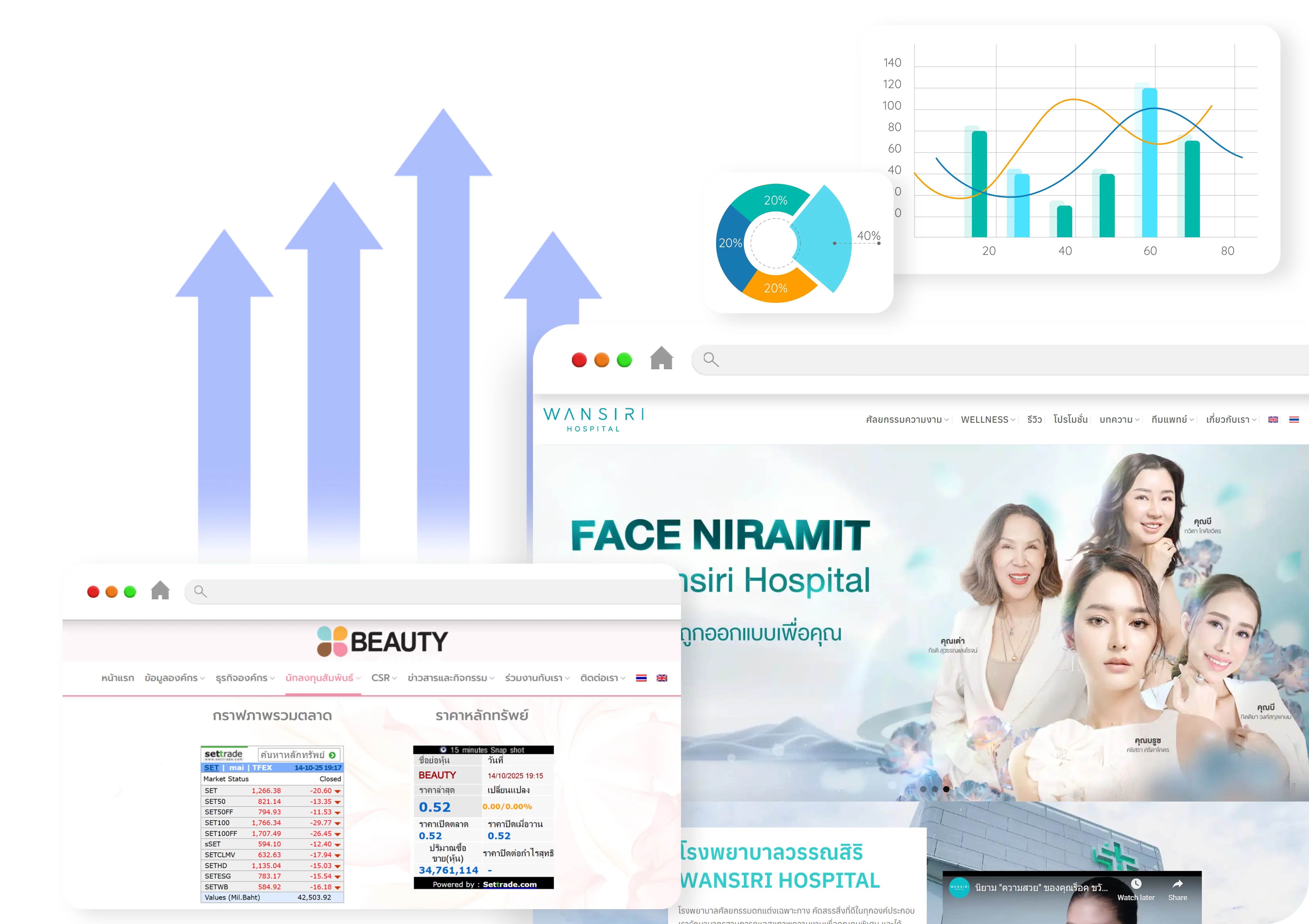 ลูกค้าหลายราย ได้ไว้วางใจให้เราพัฒนาเว็บไซต์ อาทิเช่น สำนักงานผู้ตรวจการแผ่นดิน, บริษัท บิวตี้ คอมมูนิตี้ จำกัด (มหาชน), บริษัท ยูบิลลี่ เอ็นเตอร์ไพรส์ จำกัด (มหาชน), บริษัท เอส พี วีไอ จำกัด (มหาชน), บริษัทดอยคําผลิตภัณฑ์อาหาร จํากัด, สมาคมกีฬาเรือพายแห่งประเทศไทย, บริษัท อะโพจี เวิร์ลดไวด์ จำกัด (Digital2home) เป็นต้น
